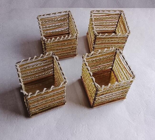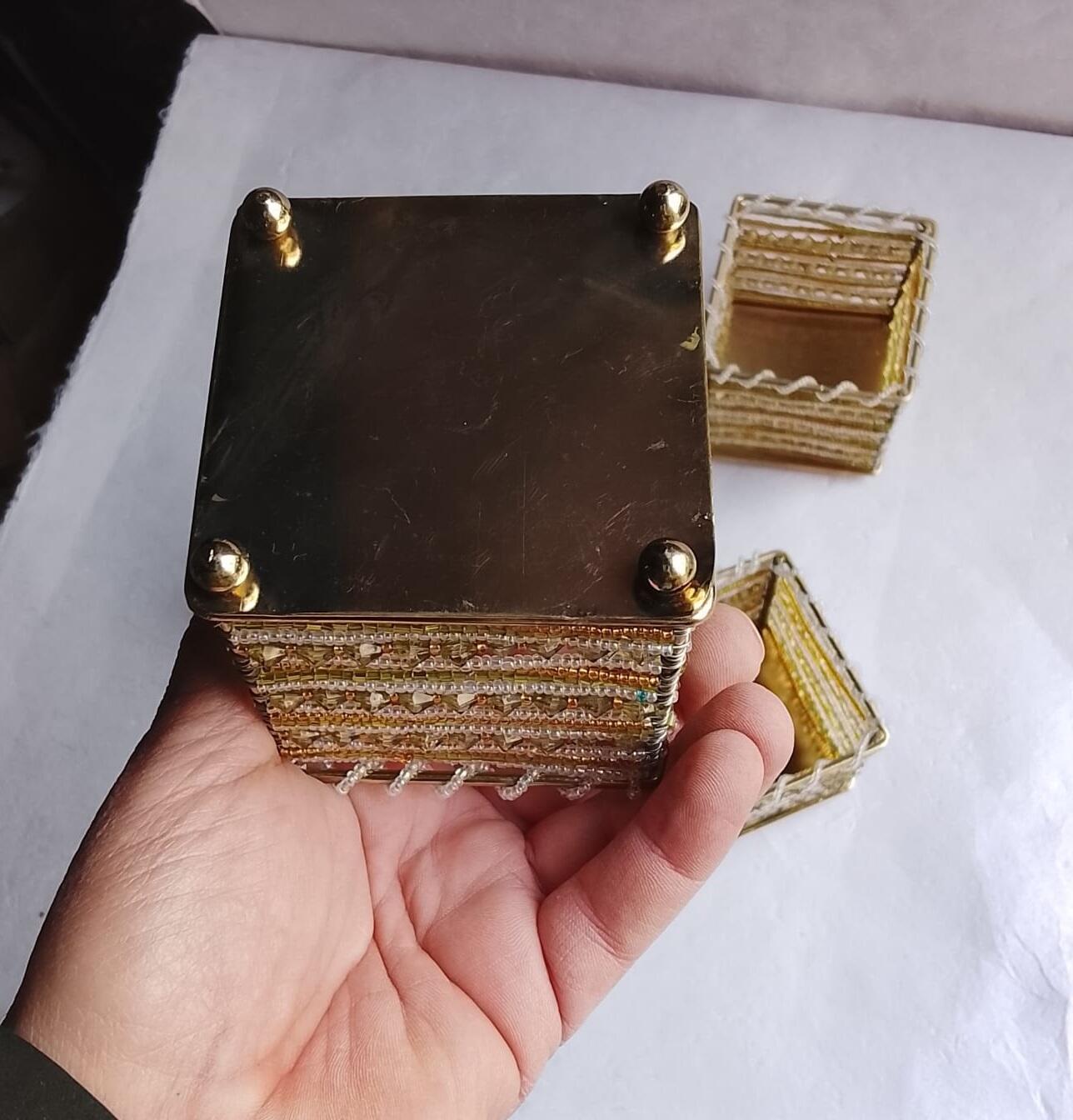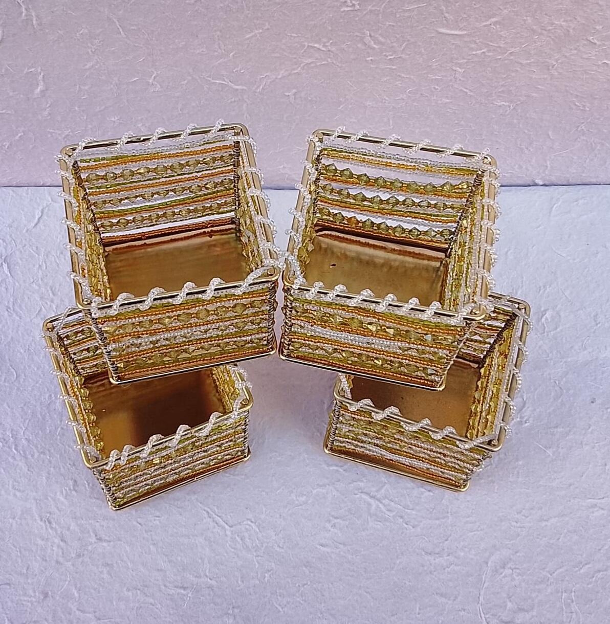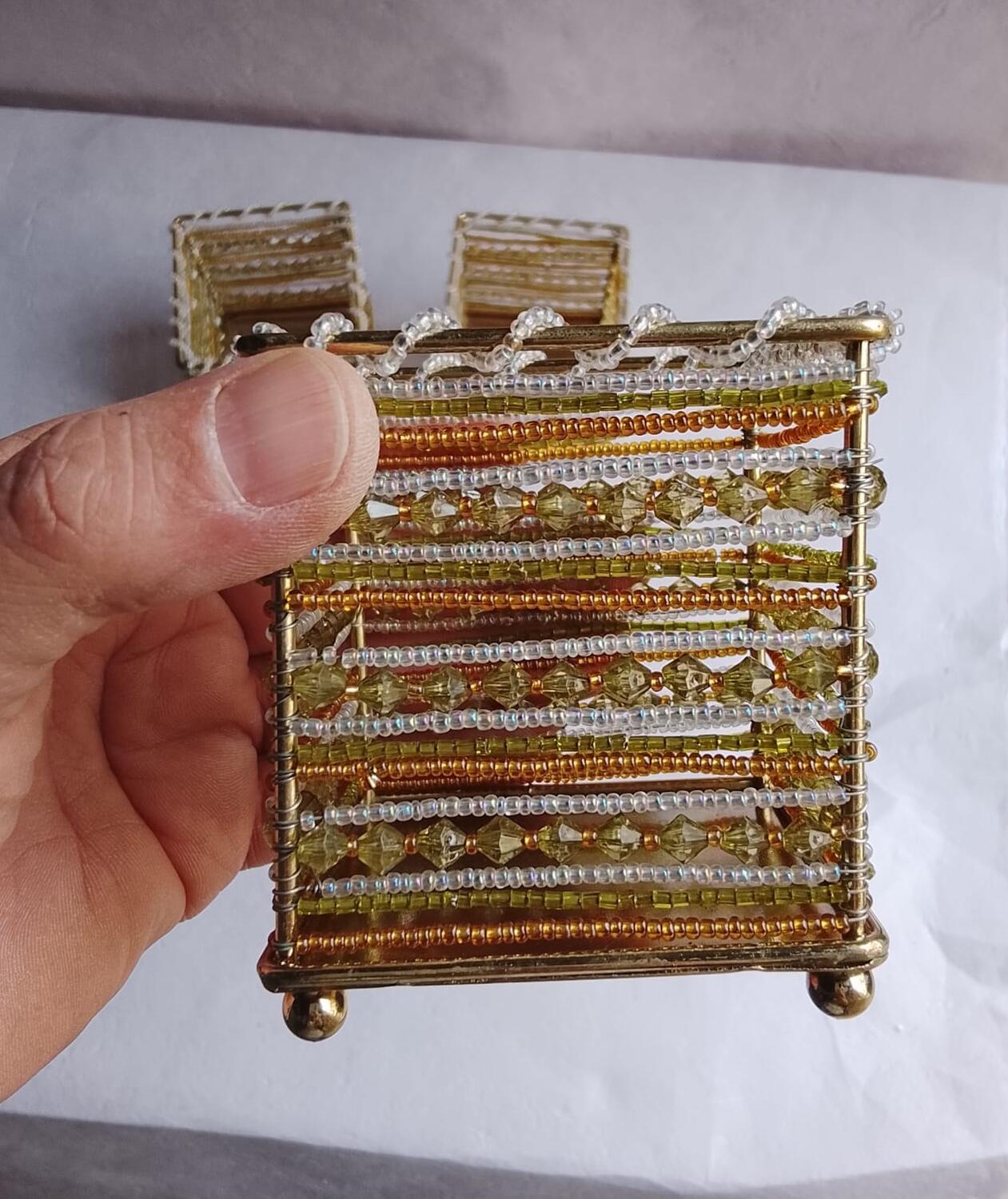 Aggiungi un tocco di luce e vivacità ai tuoi spazi con questo esclusivo set di 4 contenitori etnici realizzati a mano. Ogni pezzo è caratterizzato da una solida struttura in metallo dorato, finemente intrecciata con perline colorate di diverse forme, che creano un design esotico e raffinato.
