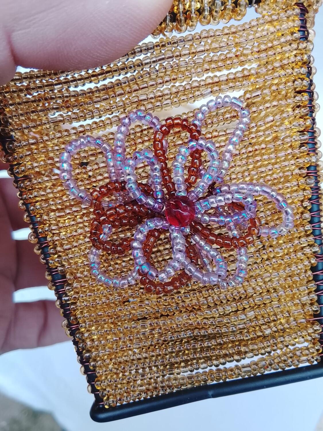 Design: Decorazioni floreali con perline color ambra e ametista.