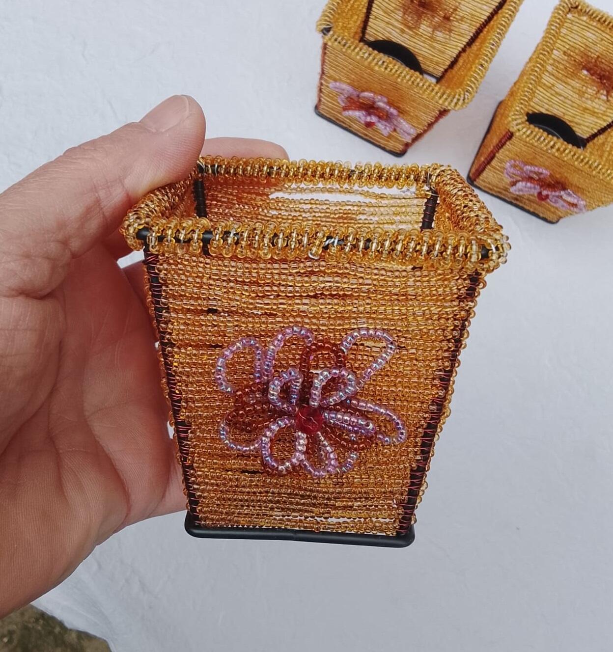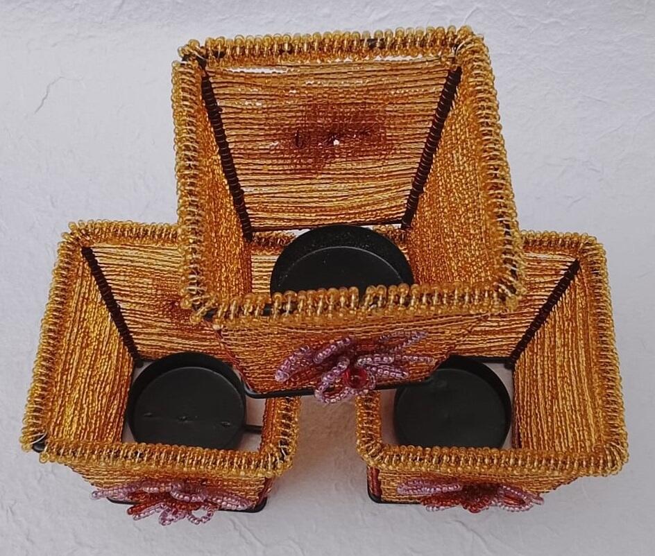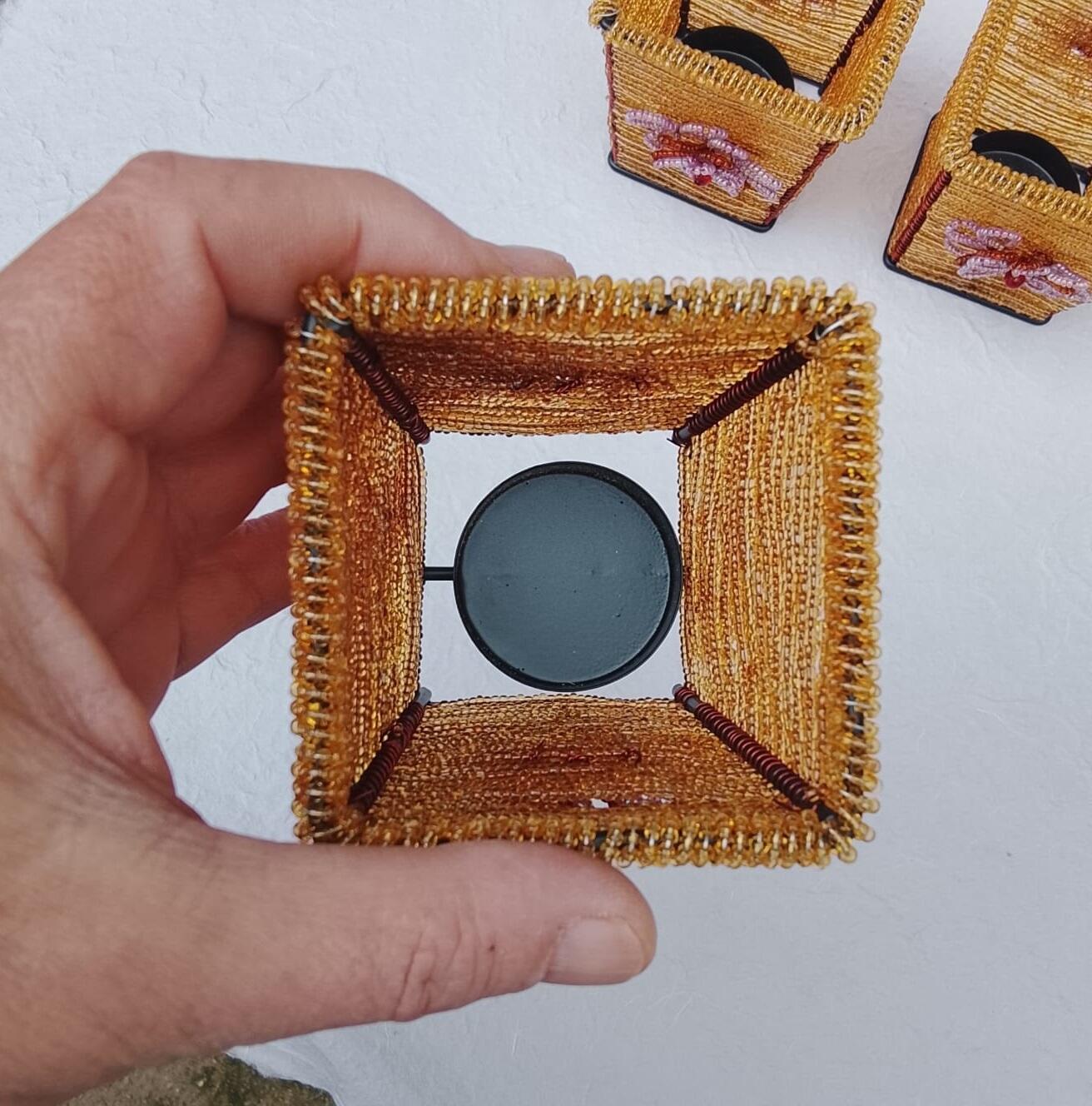 Ogni pezzo presenta una struttura finemente lavorata con un rivestimento che richiama le tonalità dell'ambra, impreziosito da un raffinato decoro floreale in perline applicate artigianalmente. La luce filtra attraverso la trama creando riflessi dorati, ideali per scaldare l'atmosfera di un salotto o di una camera da letto.
