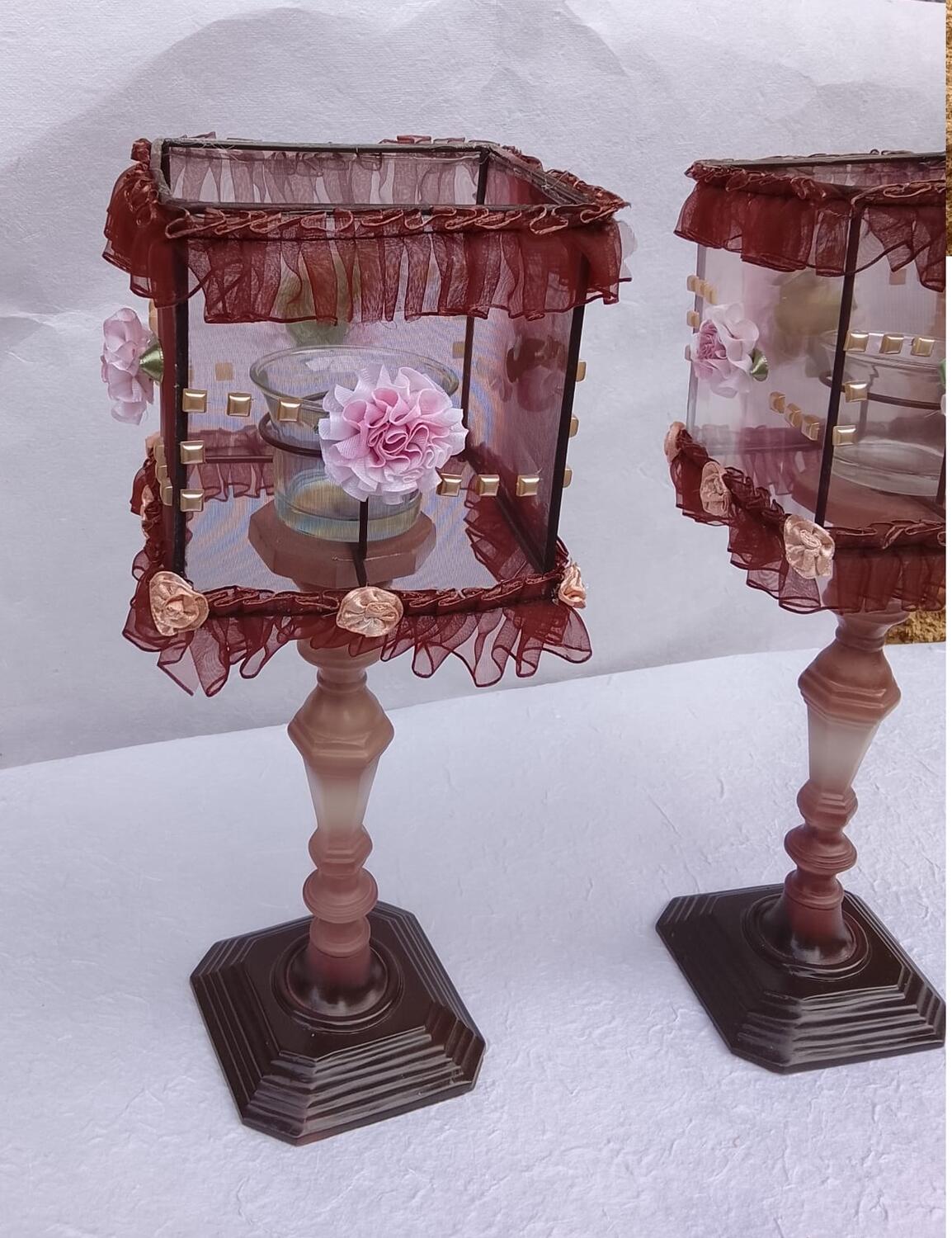 Ogni pezzo è un piccolo capolavoro di decorazione, caratterizzato da un fusto slanciato e un paralume in tulle bordeaux arricchito da delicati fiori in tessuto. Questi lumi sono ideali per creare un'illuminazione soffusa e un'atmosfera romantica durante cene speciali o per decorare con classe mensole e tavolini.