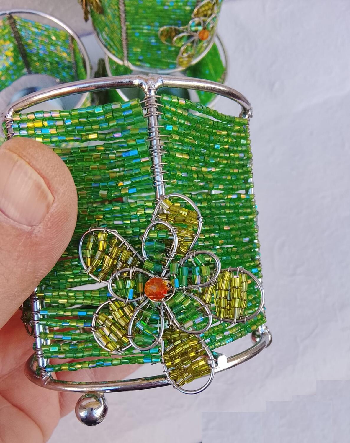 Design Unico: Una struttura cilindrica in metallo argentato fittamente intrecciata con file di perline nei toni del verde prato e verde acqua, che filtrano la luce creando un'atmosfera calda e vibrante.
