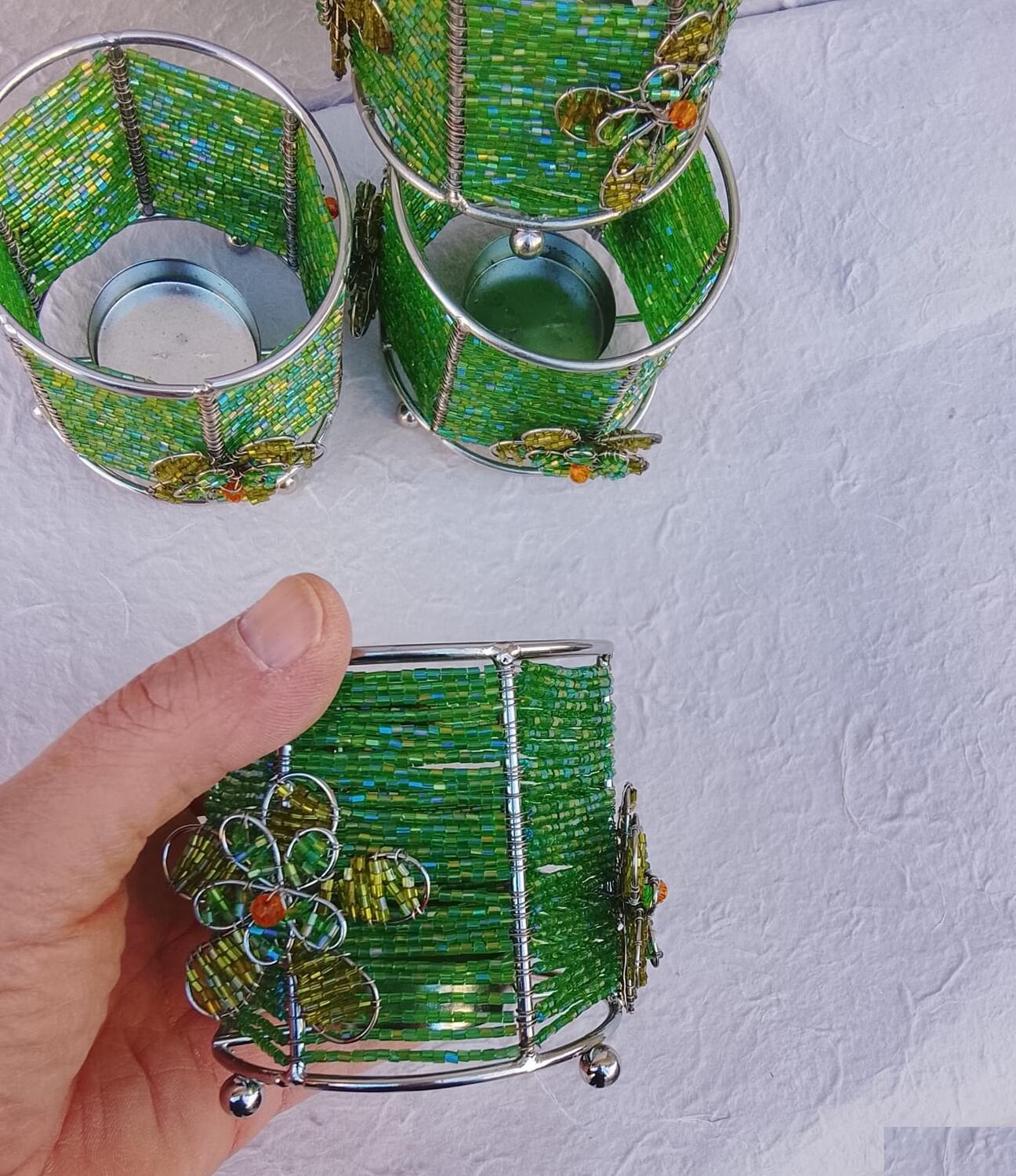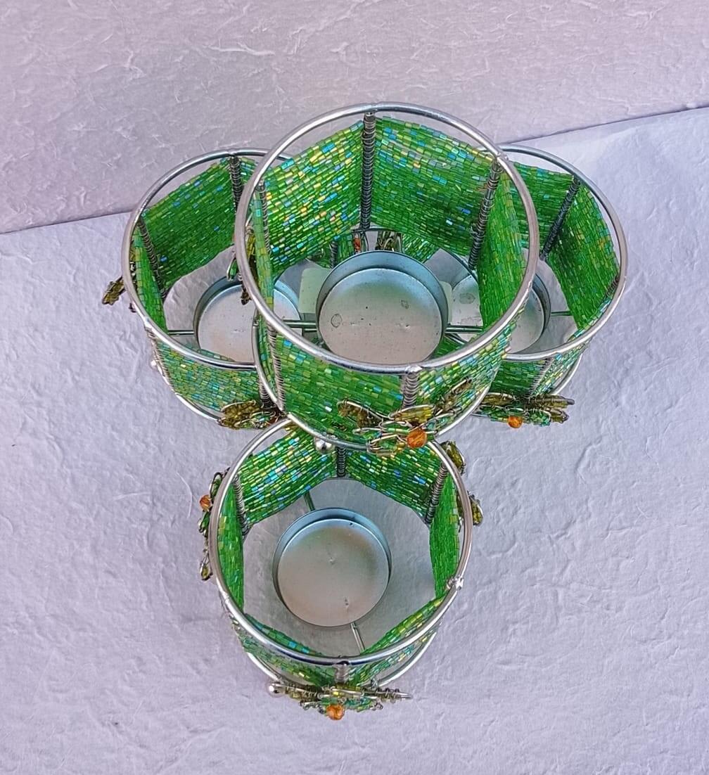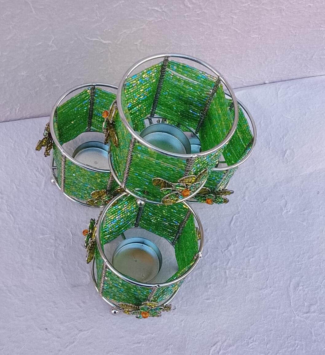 Eleganza Artigianale e Giochi di LuceAggiungi un tocco di freschezza e colore alla tua casa con questo esclusivo set di 4 porta candele realizzati interamente a mano. Ogni pezzo è un piccolo capolavoro di precisione, che unisce la robustezza del metallo alla delicatezza delle perline di vetro.