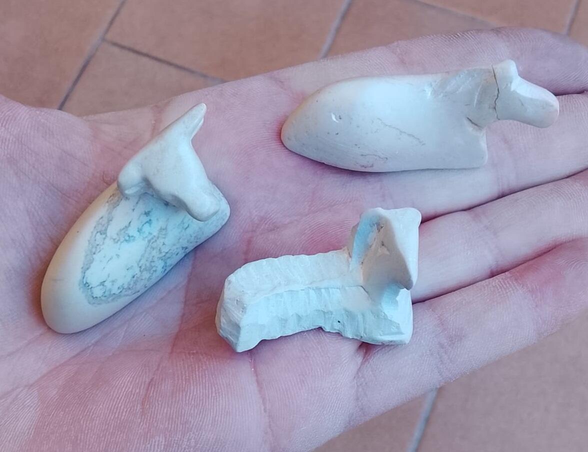 I personaggi presentano sfumature uniche che vanno dal beige crema al rosa terroso/rosso, tipiche di questa pietra, esaltandone l'origine naturale.