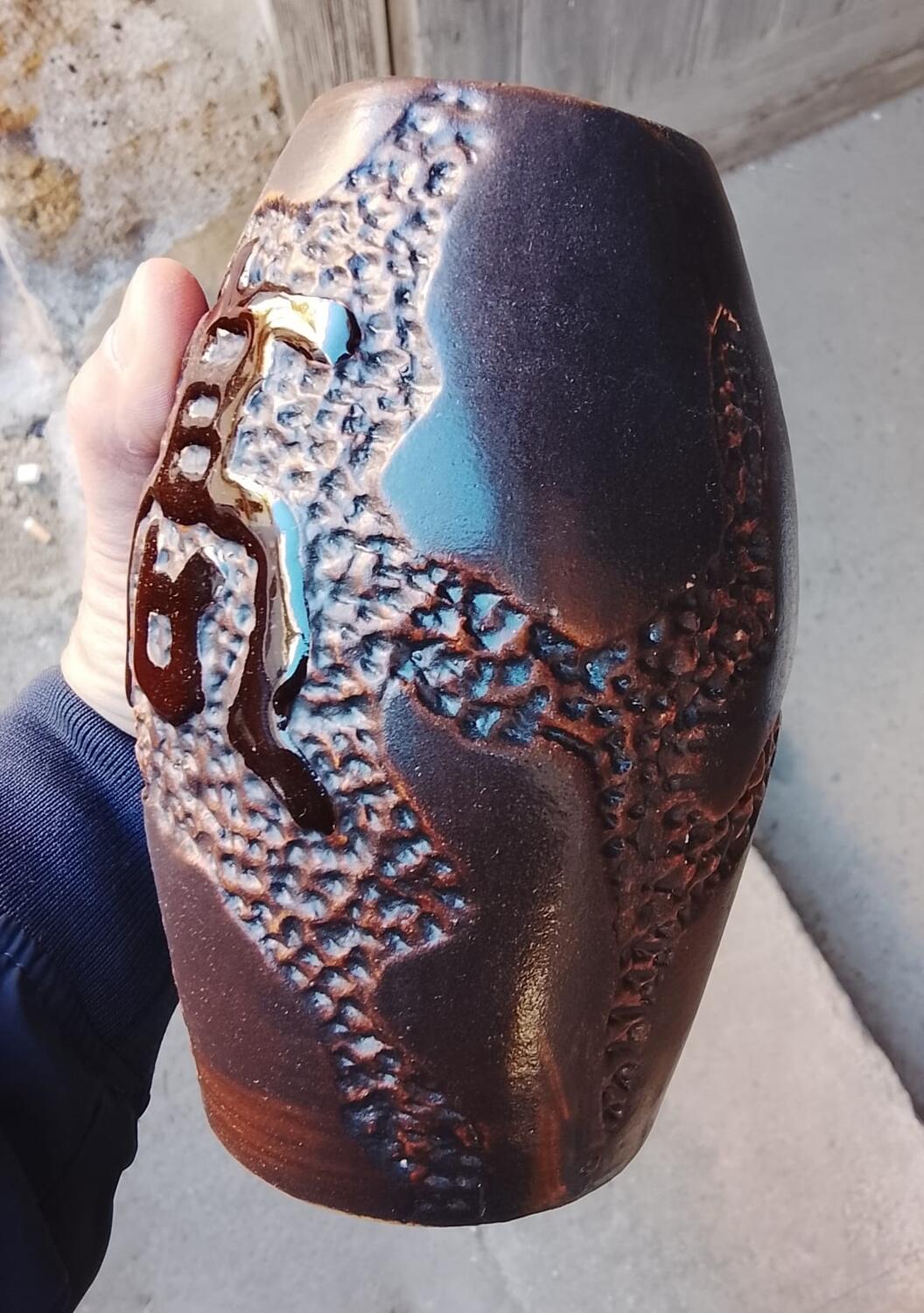 La sua silhouette elegante è arricchita da una profonda tonalità marrone scura che fa da sfondo a texture materiche a rilievo finemente lavorate.