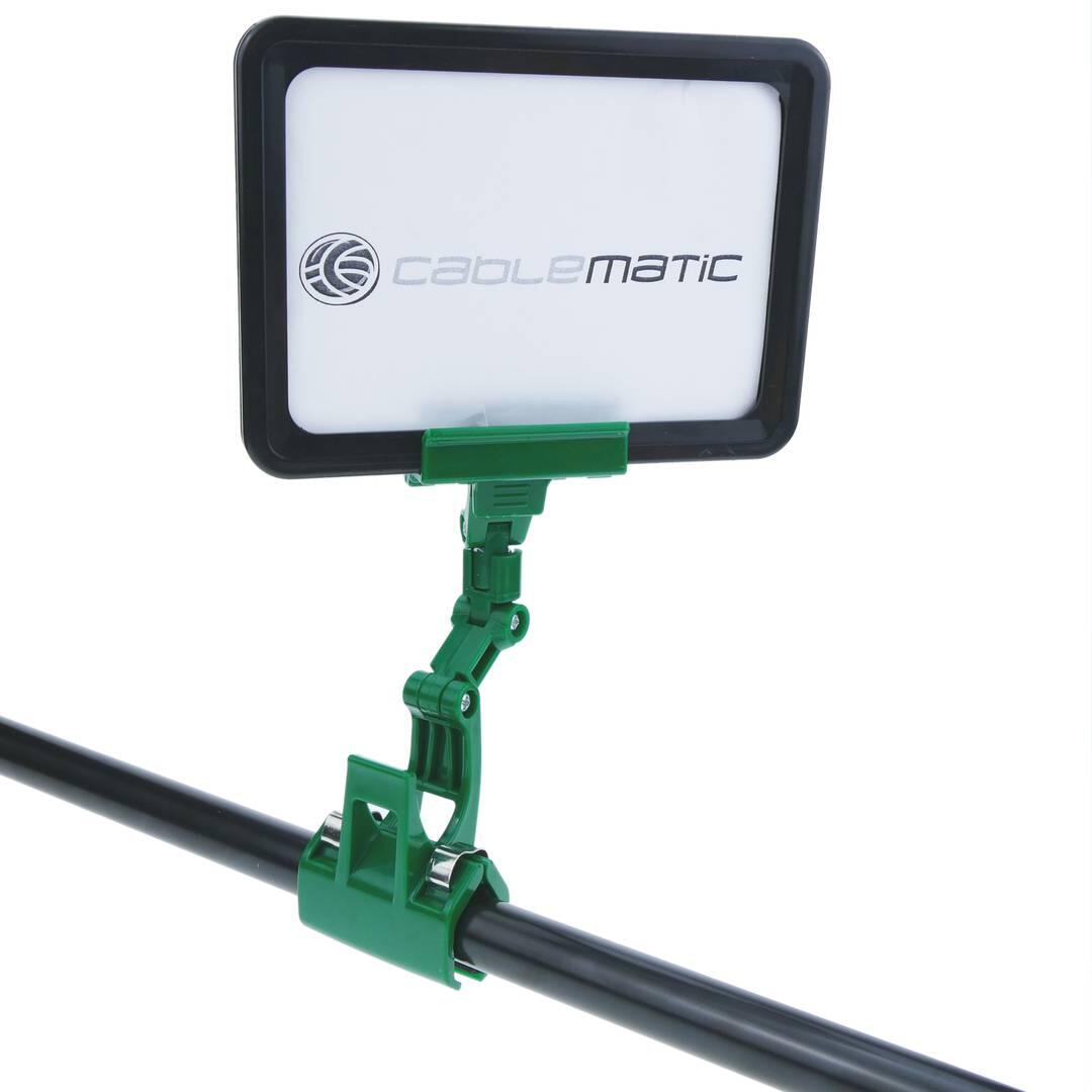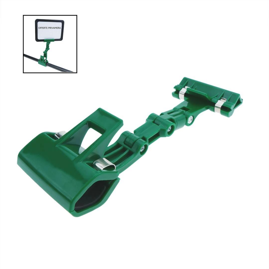La struttura a doppia clip permette di agganciare saldamente il supporto a bordi di cesti, scaffali o tubolari, mentre la clip superiore sostiene saldamente il cartellino del prezzo o la scheda descrittiva.